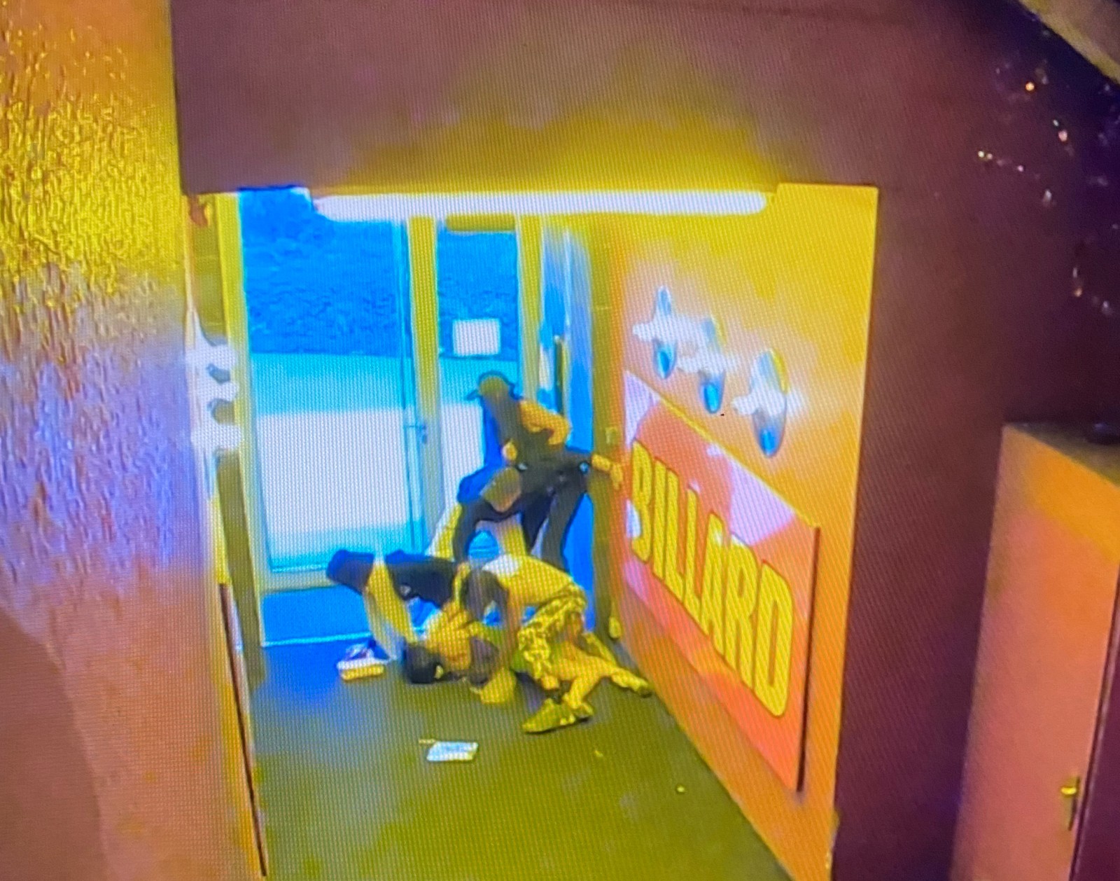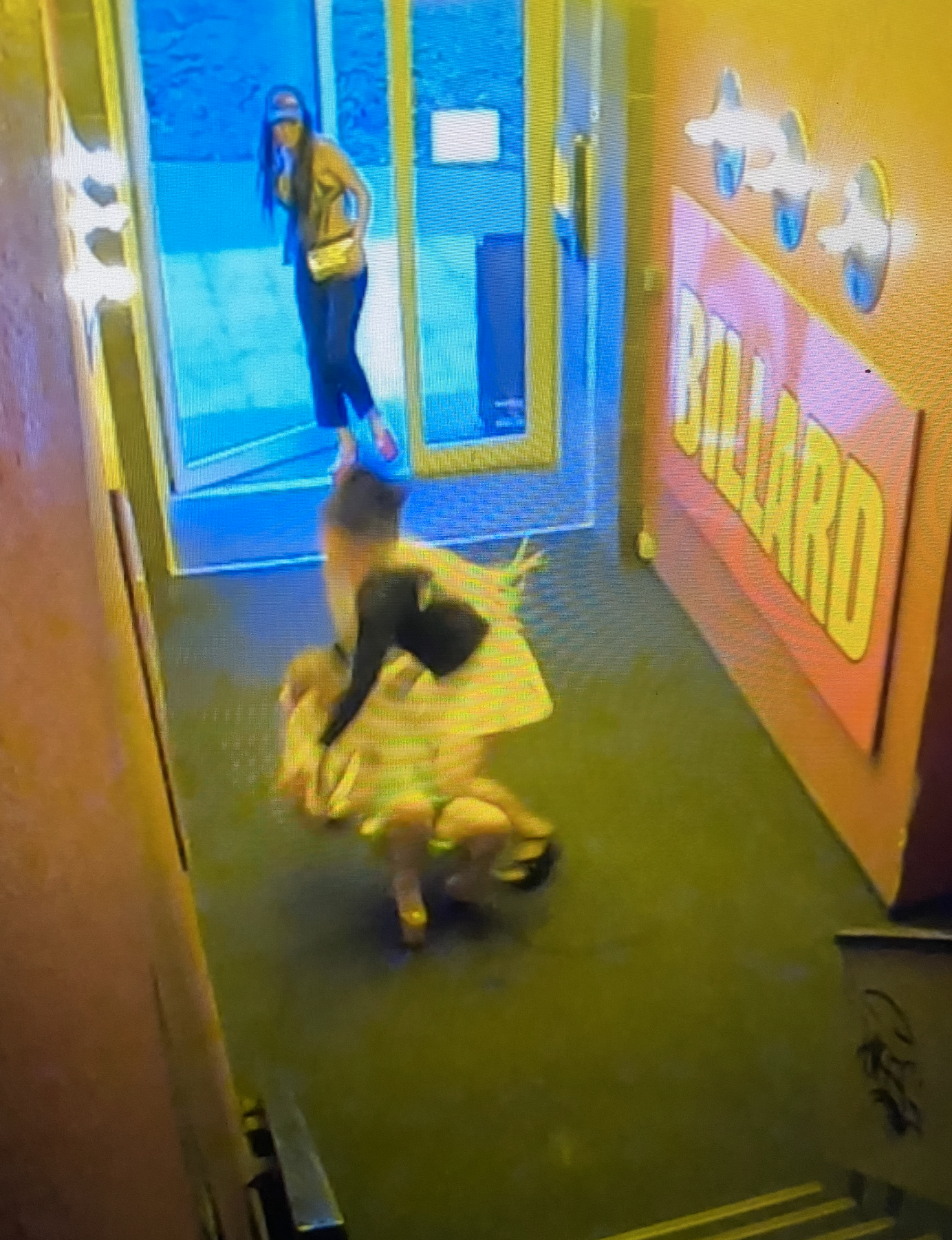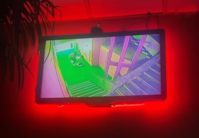 A staircase leads from the entrance to the upper rooms, monitors are installed on the walls in two different rooms upstairs, and a fake surveillance video simulating a "bitch fight".